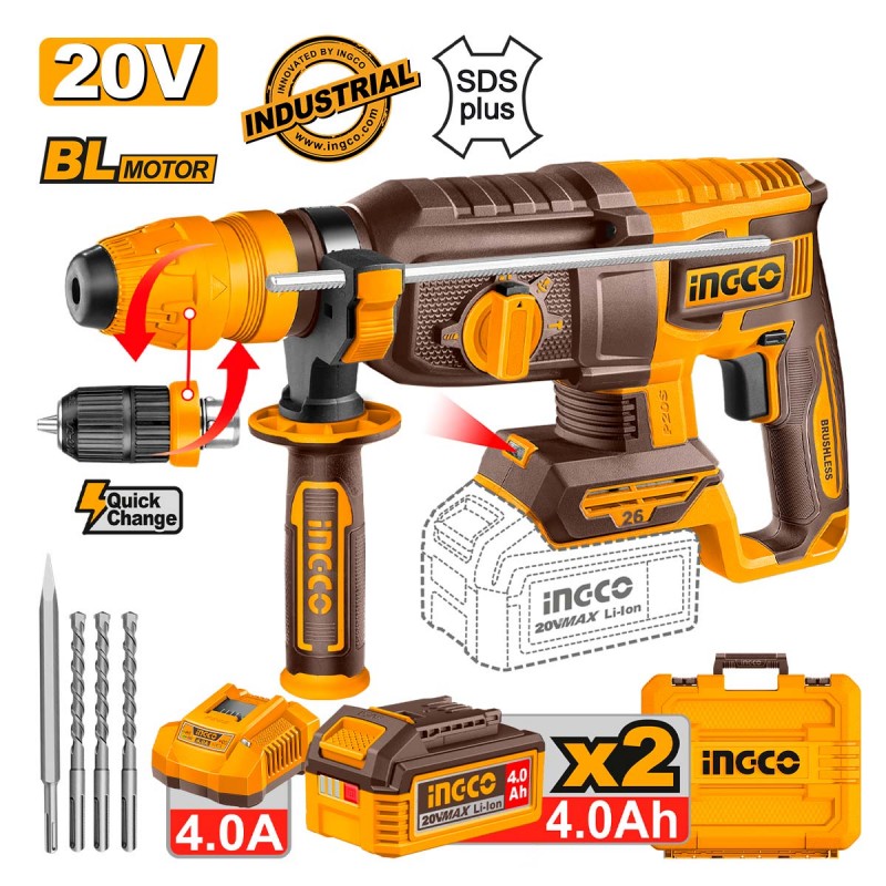 - Λεπτομέρειες προϊόντος: Κρουστική ισχύς 2.5J, Τσοκ SDS plus, Μέγεθος τρυπανιού έως Φ 26mm. Brushless Motor (μοτέρ χωρίς καρβουνάκια) 4 Λειτουργίες: • Διάτρηση με κρούση (σκυρόδεμα ή πέτρα) • Διάτρηση χωρίς κρούση σε ξύλο, μέταλλο, κεραμικά και πλαστικά • Ελεύτερη περιστροφή για ρύθμιση θέσης καλεμίσματος • Σκαπτικό Δυνατότητες τρυπήματος: Μπετόν 26mm, Ατσάλι 13mm, Ξύλο 30mm.
