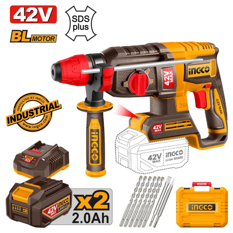 - Περιεχόμενα συσκευασίας: 1 τεμ. Φορτιστής 2A (FCLI42021E) 2 τεμ. Μπαταρίες 42V 2.0Ah Li-Ion (FBLI42201E) 1 τεμ. Βελόνι, 1 τεμ. Καλέμι, 6 τεμ. Τρυπάνια Τετράκοπο SDS plus S4L: 6,8,10,12,14,16mm με μήκος 160mm. 1 τεμ. Οδηγό βάθους, Πλαϊνή χειρολαβή, Πλαστική βαλίτσα.