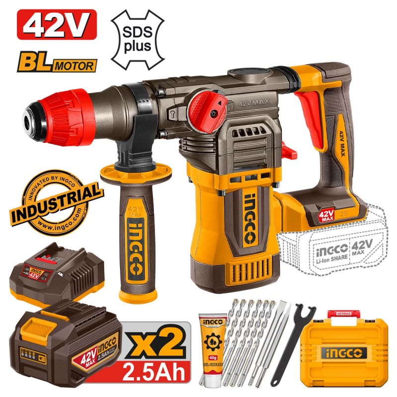 - Περιεχόμενα συσκευασίας: 1 τεμ. Φορτιστής 2A (FCLI42021E) 2 τεμ. Μπαταρίες 42V 2.5Ah Li-Ion (FBLI42251E) 1 τεμ. Βελόνι, 1 τεμ. Καλέμι, 6 τεμ. Τρυπάνια Τετράκοπο SDS plus S4L: 6,8,10,12,14,16mm με μήκος 160mm. 1 τεμ. Κλειδί, 1 τεμ. Σωληνάριο γράσσου, Πλαϊνή χειρολαβή, Πλαστική βαλίτσα.