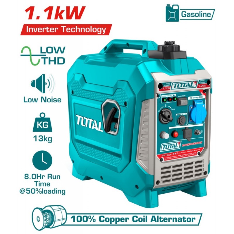 Τεχνικά ΧαρακτηριστικάΤεχνολογία inverter Ονομαστική τάση: 220-240V Ονομαστική συχνότητα: 50Hz Μέγιστη ισχύς: 1,1 kW Ονομαστική ισχύς: 1,0 kW Σύστημα εκκίνησης: χειρόμιζα Ονομαστικό ρεύμα: 4,3A Σταθερή ισχύς σε λιγότερο από 3% THD Θόρυβος (7m)@50% φορτίο: <=62dB Χρόνος λειτουργίας @ 50% φορτίο: 8,0 ώρες Ταχύτητα εξόδου: 3300-4800rpm Εναλλάκτης χάλκινου πηνίου Πρίζες: 1 τεμ 220V 16AMP / 1τεμ 12V DC 5AMP Κινητήρας: μονοκύλινδρος, 4χρονος, OHV, αερόψυκτος Κυβισμός: 56cc Ισχύς: 1.34 hp Ρεζερβουάρ καυσίμου: 3 Lit Χωρητικότητα λαδιού κινητήρα: 0,25 Lit Τύπος λαδιού κινητήρα: SAE 10W-30 Bάρος: 13 Kg Συσκευασμένο σε κουτί χρώματοςΧΑΡΑΚΤΗΡΙΣΤΙΚΑ: